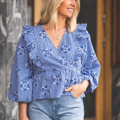 Selger en ny bluse fra JDY i lys blå/hvit rutete mønster med fine broderte detaljer. Feminin modell med omslag og knyting i siden.
