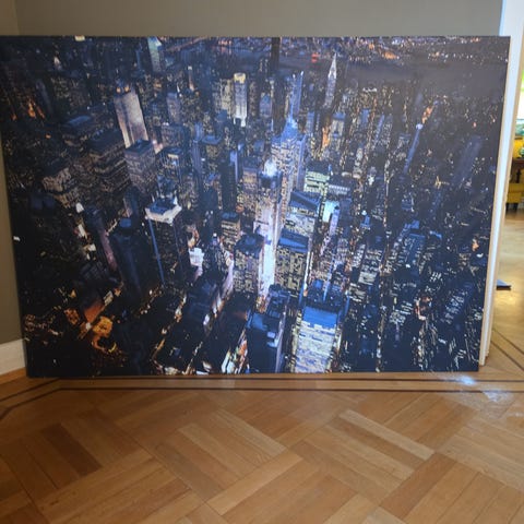 Veggbilde med motiv av New Yorks skyline i solnedgang.