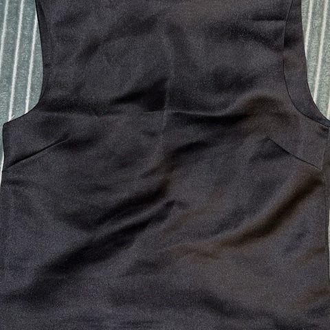 hverdagskjole for dame i størrelse XS. Kjolen er svart og laget i bomull. Den har et kroppsnært snitt med trekvart lange ermer. Foran har kjolen utskårne detaljer øverst på brystpartiet. Egner seg som enkel hverdagskjole eller til mer pyntede anledninger avhengig av styling. Merke Wasyl. Kjøpte i Polen. På lappen står M/L, men faktisk størrelsen er XS