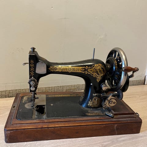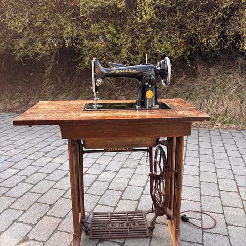 Husqvarna tråkkesymaskin selges da den bare står og støver ned . Hel og pen maskin . Bordplate skulle vært pussa og olja .