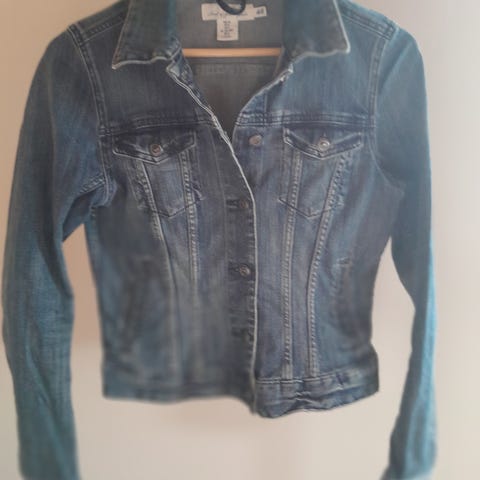 H&M Divided denimjakke str S, unisex med hette. Jakken har blå denim i bolen og gråmelerte ermer og hette i sweatshirt-materiale. Fronten har knappelukking og brystlommer med klaff og knapp. Hetten har snøring. Passer som hverdagsjakke i overgangssesonger for både kvinner og menn.