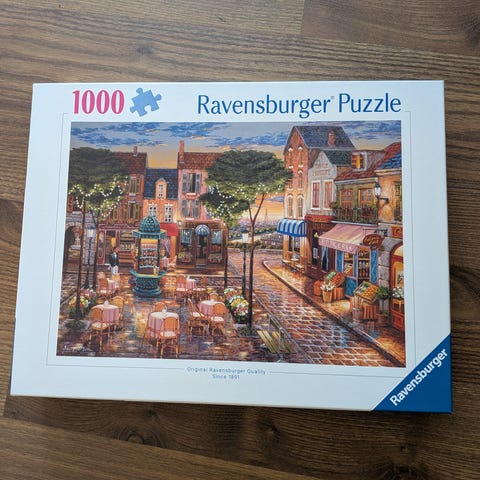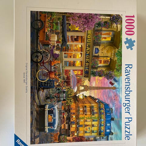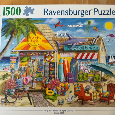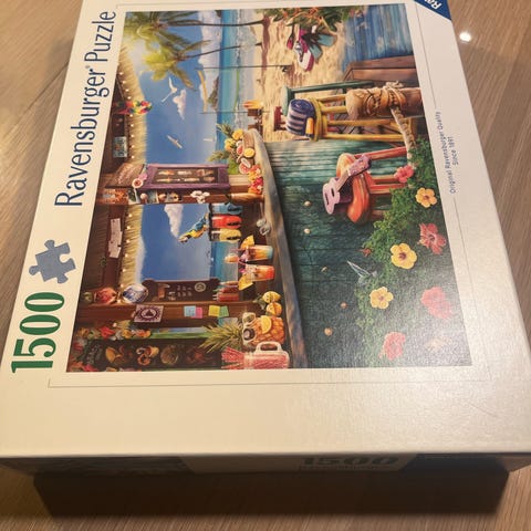 Ravensburger puzzle med 1500 brikker og fargerikt strandmotiv med strandbutikk, palmer og havutsikt.