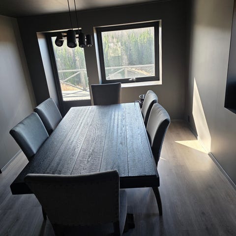 Flott stort bord i grov rustikk utførelse med tilhørende 6 stk. stoler. Svært solid og skaper en flott kontrast i moderne omgivelser. Stolene har også en rustikk utførelse og skinnet har slitasje som bare matcher bordet bedre. Kan demonteres på få min. slik at understell og bordplate enkelt kan transporteres. Ta kontakt for mer informasjon eller bilder. Svarer raskt på meldinger.