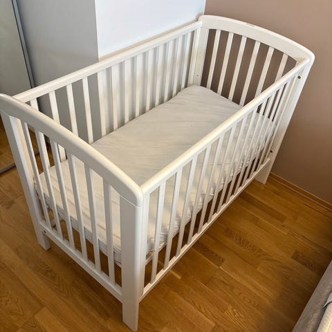 Hvit sprinkelseng 60x120 cm. Bunnen er justerbar med tre nivåer og ene langsiden som kan heves og senkes fra utsiden.