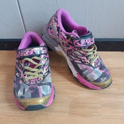 Asics joggesko for barn i størrelse 30. Skoene er unisex og har svart overdel med rosa detaljer. Overdelen er i pustende mesh-materiale med syntetiske forsterkninger. Modellen har borrelås og elastiske lisser for enkel av- og påkledning. Sålen er i lett materiale med mønster for bedre grep. Egnet som hverdagssko og til lett aktivitet for barn.