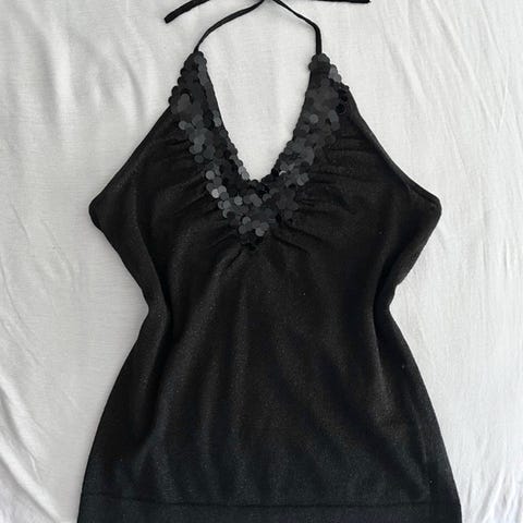 Selger en stilig svart topp dekket med glitrende paljetter. Perfekt for festlige anledninger, julebord eller nyttårsaften. Toppen har en flatterende passform og sitter behagelig på.