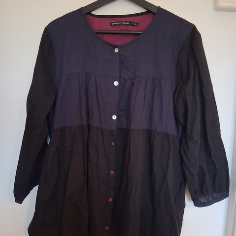 Skjorten er lilla med veldig finne broderier i forsiden og baksiden, og passer fint for damer og menn. Den er kjøpt brukt, men er ikke synlig brukt i det hele tatt. Har selv bare brukt den en gang.