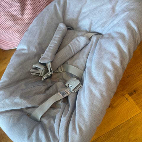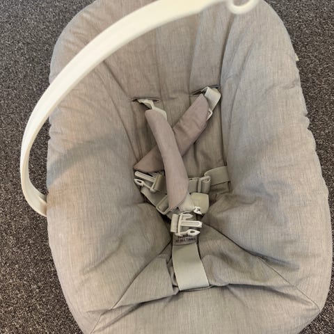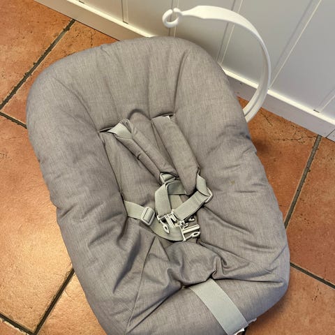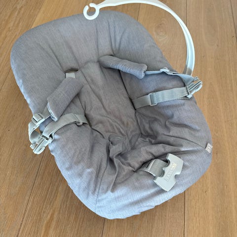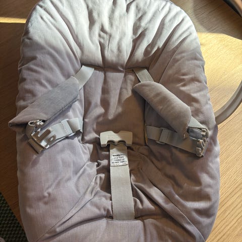 4moms barnestol. Myk stol med integrert sele for barn. Nøytral, lys farge som passer inn i de fleste hjem. Egnet til bruk innendørs som sitte- og hvileplass for små barn, avhengig av barnets alder og vekt i henhold til produsentens anbefalinger.