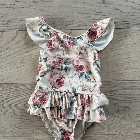Newbie badedrakt for jente i størrelse Badedrakten er laget i polyester og har et flerfarget blomstermønster. Modellen har stropper over skuldrene og volangdetaljer i livet. Egnet til bruk ved bading og vannlek for små barn.
