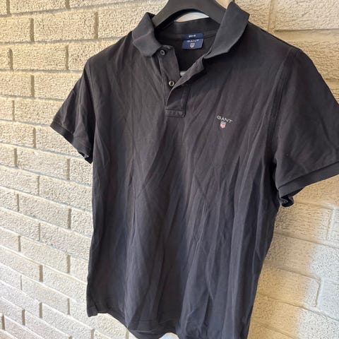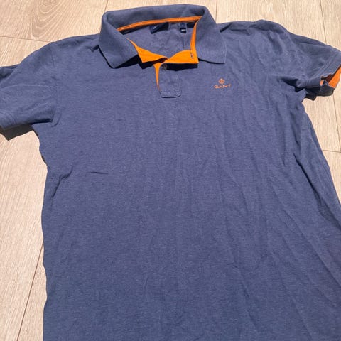 Gant pique t-skjorte for herre i størrelse L. T-skjorten er blå med horisontale striper og har klassisk krage og kort erm. Materialet er 100 % bomull.