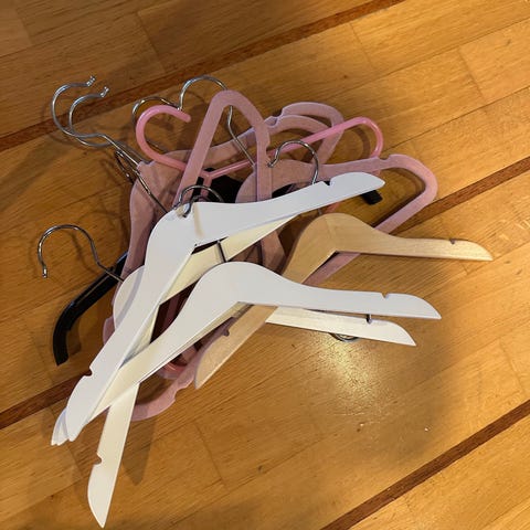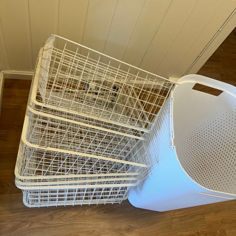 Oppbevaring i stoff. Henges opp rundt en stang eller liknende.