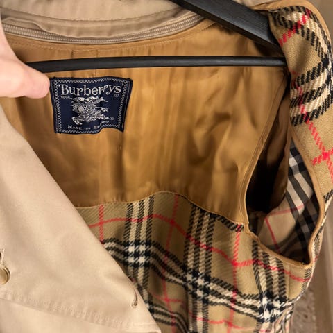 Burberry frakk kjøpt høsten 1984 hos Burberry på Picadelly i London. Den er ikke brukt.