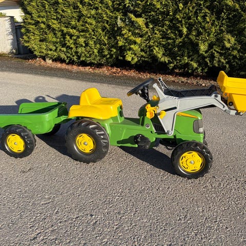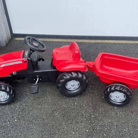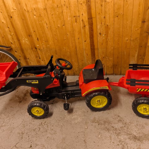 Pent brukt tråtraktor med stor tilhenger selges. Traktoren har gummidekk. Ny pris samlet 5100 kr.