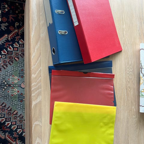 Spiralhefter/notatbøker i ulike farger og størrelser, forelesningshefter, plastmapper med strikk og håndtak, samt skilleark og registerark for permer + perm.