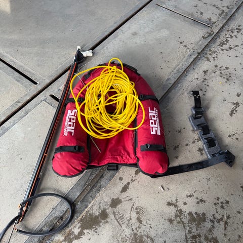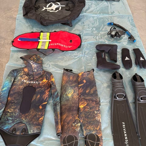Sett med flere deler til fridykking og undervannsjakt. Inneholder lange fridykkerfinner fra Frivannsliv, våtdrakt i neopren med hette, hansker og sokker i neopren, vektbelte med vekter samt kamuflasjevest.