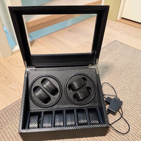 Watch Winder i tre. Fått i gave, ubrukt. Følger med ladekabel og en pusseklut.