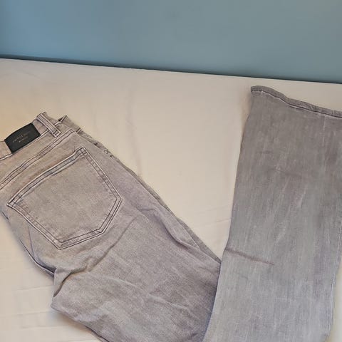 Vailent Flare jeans for dame i grå denim. Buksen er i størrelse S med livvidde W28. Modellen har sleng (flare) og er laget i denim-materiale. Egner seg som hverdagsbukse eller til mer pyntede antrekk.