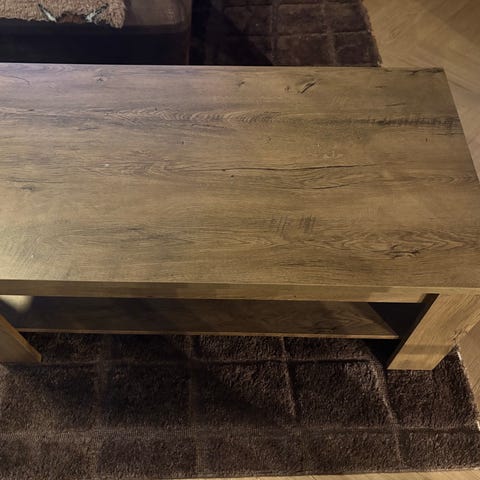 Selger et sofabord i laminer eik. Pent brukt.