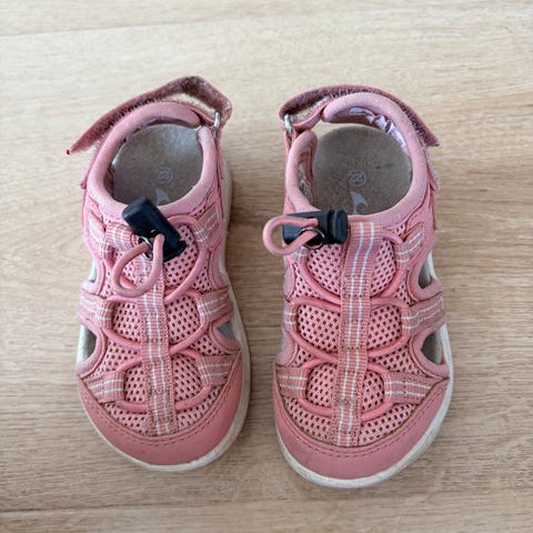 Viking sandaler for barn i størrelse 22. Åpne sandaler i rosa farge, laget med pustende materiale og gummisåle. Justerbar lukking med strikk og borrelås for god passform. Passer til jente til bruk i hverdagen og utelek i varmt vær. Pent brukt av ett barn i en sesong🩷