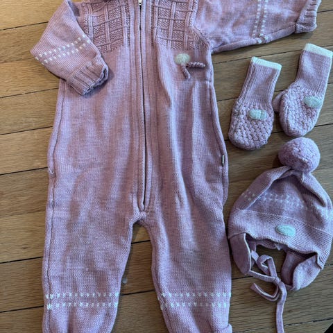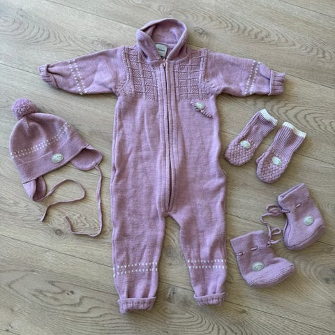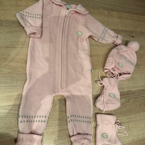 Dress, lue, votter og tøfler. Størrelse 62 i babyrosa.