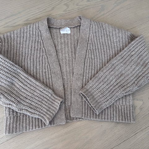 Zara cardigan for dame i størrelse L. NB! Liten i størrelsen, mer en S. Cardiganen er brun og laget i et polyesterbasert materiale. Modellen har v-hals, lange ermer og ribbestrikkede kanter nederst og på ermene. Lukkes med knapper foran. Egner seg som et lett lag over topper, skjorter eller kjoler i hverdagen eller på jobb.