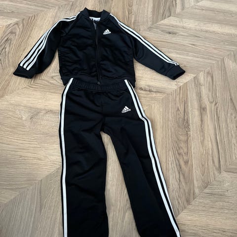 Adidas joggedress for barn i størrelse 98. Sett med hettejakke med glidelås og bukse. Farge svart med gule striper langs ermene og buksebeina, samt Adidas-logo på både jakke og bukse.