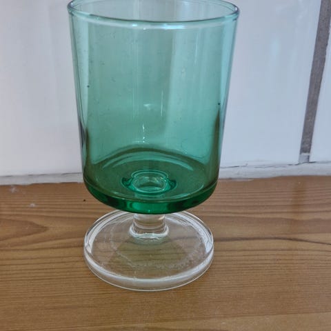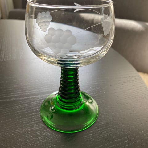 Rømerglass med grønn fot. Klart glass øverst og grønn, riflet stett/fot i glass. Egnet til servering av for eksempel vin, vann eller andre drikker ved borddekking og selskap. Selges som sett på bildene.