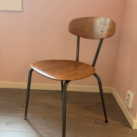 T-stol av Arne Jacobsen. Den er ganske slitt og mangler finer på noen plasser, men er fin å sitte på og fast i ryggen.