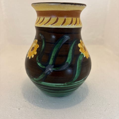 Fin gammel vase fra Egersund Fayancefabrik (EFF), merket “Egersund Norge No. 18” på bunnen. Vakker gul glasur med håndmalt blomsterdekor i grønt og brunt. Egersund Fayancefabrik produserte keramikk fra 1847–1979 og er ettertraktet norsk antikvitet. Står støtt og er i god stand uten synlige skader.