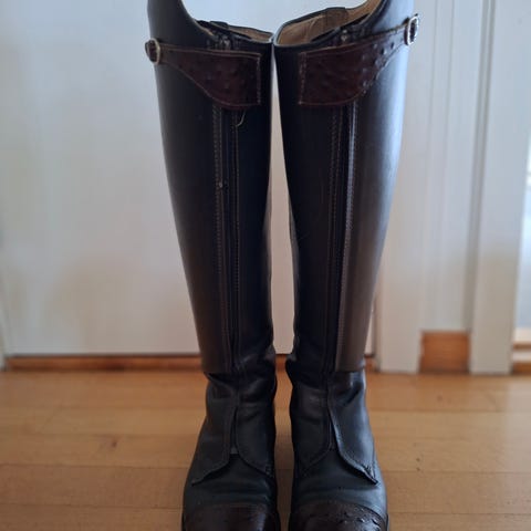 Høye ridestøvler i brunt skinn. Klassisk modell med glidelås bak og knapp øverst på skaftet. Robust såle og rund tå.