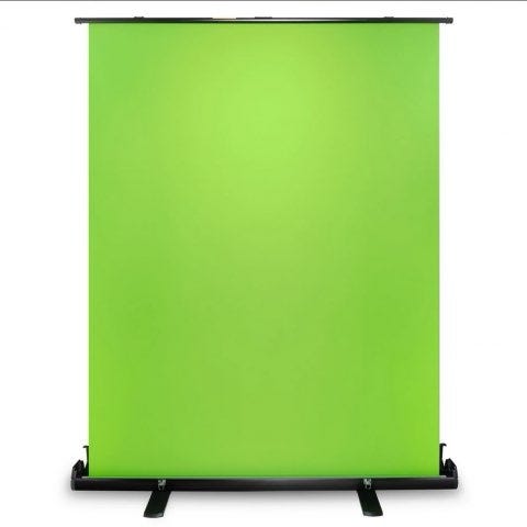 Grønn roll up bakgrunnsvegg med frittstående stativ. Bakgrunnen er montert på en bunnkassett og kan rulles opp og ned etter behov. Stativet har støtteben i metall og kryssramme på baksiden som holder duken stram. Egner seg som bakgrunn til foto, video, presentasjoner eller messer der det er behov for en ensfarget flate.