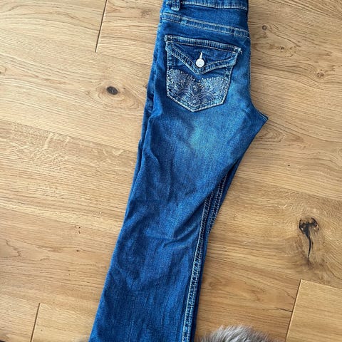 Selger jeans fra Gina Young i størrelse 164cm i modell: Low boot embroidery jeans. Denne mangler en knapp på lommen bak, ellers i god stand. Fargen er i gråsort eller washed Black