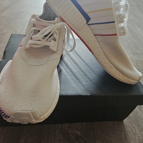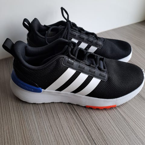 Adidas løpesko i størrelse 40. Skoene har grå overdel i pustende mesh med oransje striper og svarte lisser. Sålen er hvit med mønster som gir grep ved løping. Egnet til løping og annen lett trening.