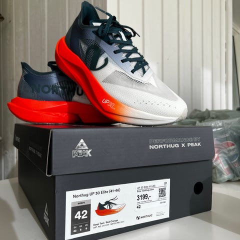 Northug UP 30 Elite full karbon løpesko i størrelse 42. Modellen er en lett løpesko med overdel i pustende tekstilmateriale. Skoen har hvit og oransje fargekombinasjon med snøring foran. Yttersålen har mønster for grep og stabilitet ved løping på hardt underlag. Egnet til løping og annen trening der det er behov for lette og responsive sko. Selges da str ble feil. Kun prøvd en gang på mølle.