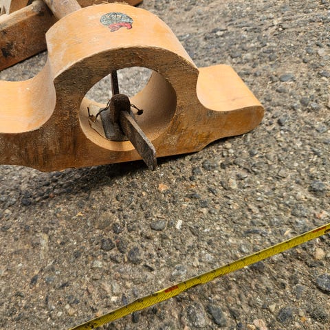 Ambika høvel med trehåndtak og metallkropp. Høvelen har justeringshjul i metall, bakre grep og fremre knott i tre. Passer til høvling og planering av treverk i snekker- og hobbyarbeid. Kniven er festet med metallkappe merket Ambika.