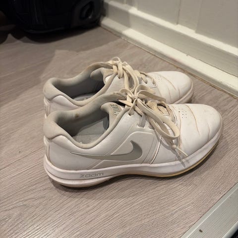Selger et par Nike golfsko i størrelse 45 (US 11). Klassisk og stilrent design i hvitt og sort som passer til det meste av golfantrekk.