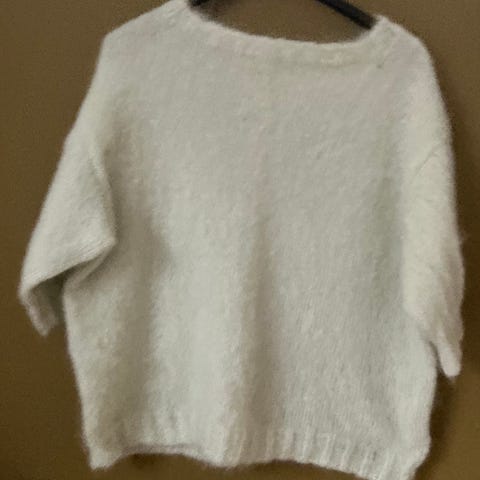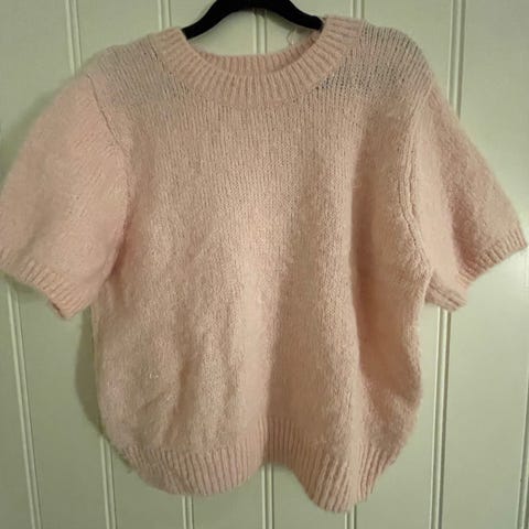 Gina Tricot genser med korte ermer i størrelse S. Genseren er rosa og strikket i en ullblanding. Den har rund hals, ribbestrikkede kanter nederst, i halsen og på ermene. Passer til dame og kan brukes alene eller over en tynn topp på kjøligere dager.