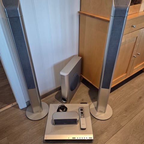 Pakken inneholder 5 surroundhøyttalere + subwoofer, dvd recorder, multikanalsforsterker og Technics 5-cd veksler. Technics 5-cd veksleren mangler fjernkontroll og har en ripe på toppen av boksen.