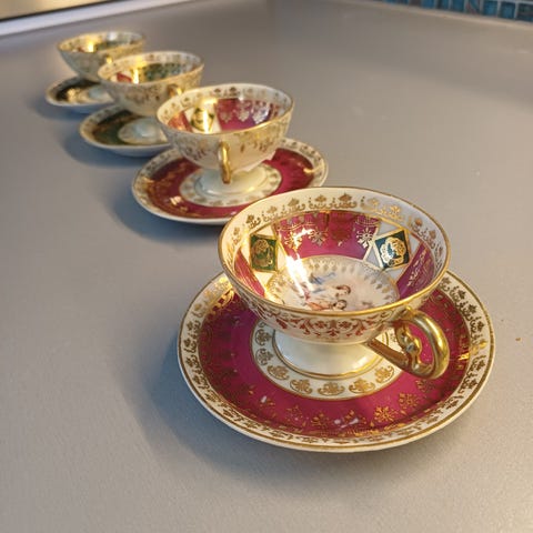 Egner seg til servering av espresso eller annen sterk kaffe. Porselenet er dekorert med mønster i gullfarge som går igjen på både kopper og skåler.