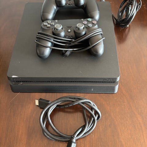 Sony Playstation 4 slim 500gb hardisk. spillkonsoll i svart. Standard PS4-modell med tilkoblingsporter på baksiden for strøm, HDMI og nettverk. Konsollen leveres med en kablet håndkontroller i svart som vist på bildene. Egnet for bruk med kompatible PS4-spill og tilkobling til TV eller skjerm via HDMI.