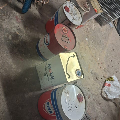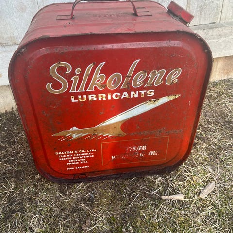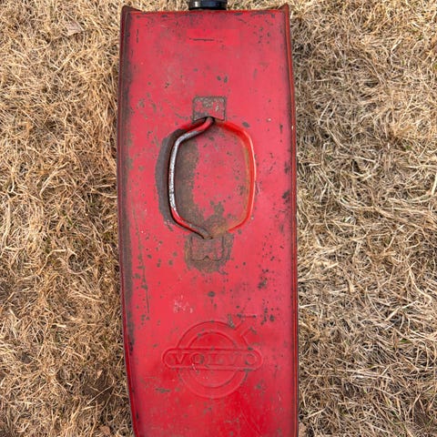 Stålkanner av gammel type selges kr 500. Rød kanne brukt til bensin.
