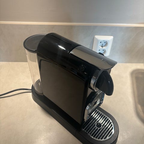 Nespresso kapselmaskin i kompakt bordmodell. Maskinen har front i metall med dryppbrett og avtagbar vanntank bak. Egnet for bruk med Nespresso-kapsler til tilberedning av espresso og kaffe hjemme eller på kontor. Strømledning bak for tilkobling til vanlig stikkontakt.