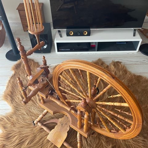 Rokken er laget i heltre med dreid hjul og klassisk understell. Den har stort hjul med trøe og reimføring, samt rokkehode med snelle og vinge for spinning av garn. Egner seg til tradisjonell håndspinning eller som dekorativt møbel-/interiørelement. Detaljer som eksakt alder, produsent og treslag er ikke oppgitt.