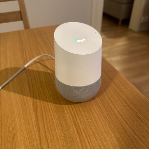 Google Home smart høyttaler i hvit og grå utførelse. Enheten har innebygde mikrofoner på toppen og berøringsfelt for enkel styring av volum og avspilling. Høyttaleren kobles til strøm via medfølgende strømkabel og brukes sammen med Wi‑Fi og kompatible enheter for stemmestyring, musikkavspilling og kontroll av smarthjem‑utstyr. Passer til bruk i stue, kjøkken, soverom eller andre rom der man ønsker trådløs lyd og stemmestyrte funksjoner.