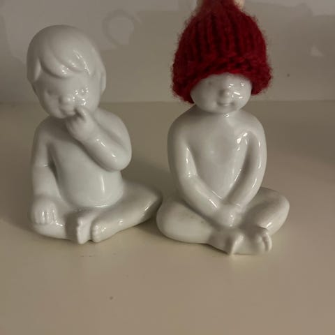 Ukjent merke porselensfigur som forestiller en sittende gutt som holder en sko. Figuren er i hvit, matt porselen og står på en avlang, avrundet sokkel. Passer som dekorasjon på hylle, skjenk eller i vitrineskap.