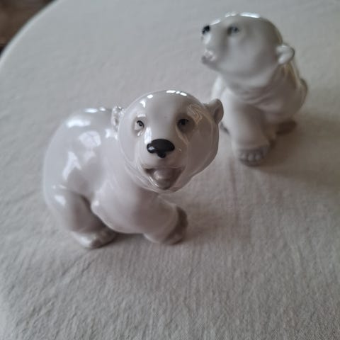 Porselensfigurer av en isbjørn i hvit glasur. Figuren står på en sokkel utformet som isflak. Har to like , selges helst samlet Undersiden har stempel