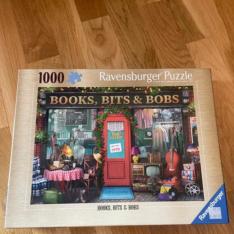 Puslespill med motivet «Books, Bits & Bobs», som viser en detaljert bok- og bruktbutikkfasade med mange små elementer og gjenstander. Passer for puslespillinteresserte som liker fargerike og detaljerte motiver.