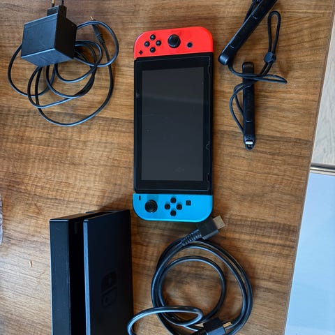 Nintendo Switch spillkonsoll med Joy-Con kontroller i fargene neon rød og blå. Den er som ny. Kjøpt i fjor og brukt kun noen få ganger.