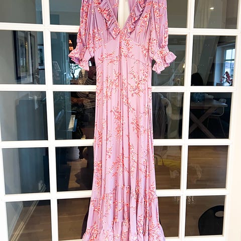 Ba&sh kjole for dame i størrelse M. Kjolen er i beige viskose med mønster og har omslagseffekt i overdelen. Den har lange ermer, markert midje med knyting og volangkant nederst på skjørtet. Passer som hverdags- eller penkjole avhengig av styling.