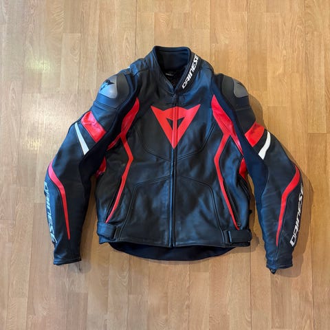 Dainese motorsykkeljakke og bukser i svart, rødt og hvitt skinn. Jakken og buksene er laget av slitesterkt skinnmateriale med beskyttende polstring på skuldre, albuer, knær og hofter. Passer for motorsykkelbruk og tilbyr god beskyttelse og komfort under kjøring. Selges da det ikke brukes lenger. Fremdeles god kvalitet. Strl 46 i jakke, og 48 i bukse. Damemodell.